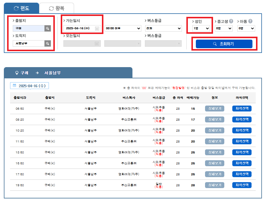 - 출발지, 도착지, 출발일을 입력하여 버스 시간을 조회합니다.