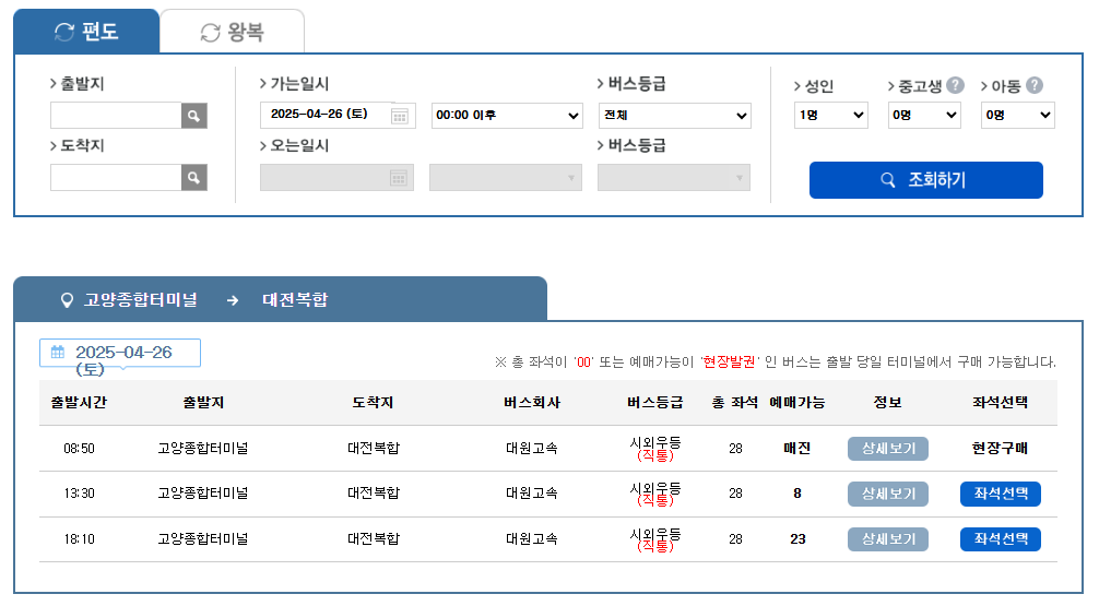 - 출발지, 도착지, 출발일을 입력하여 버스 시간을 조회합니다.