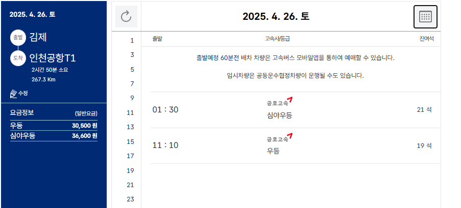 - 도착지: 인천공항 제1터미널·제2터미널