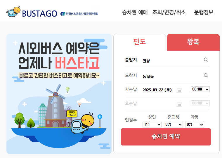 | 예매 사이트 | 버스타고 (일반 노선), 코버스 (서울행) |