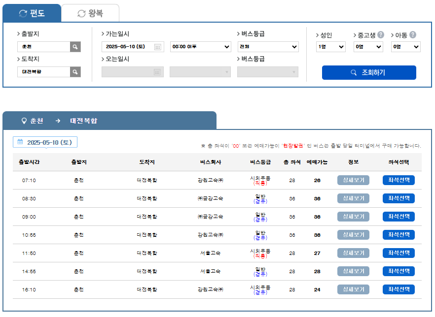 - 출발지, 도착지, 출발일을 입력하여 버스 시간을 조회합니다.