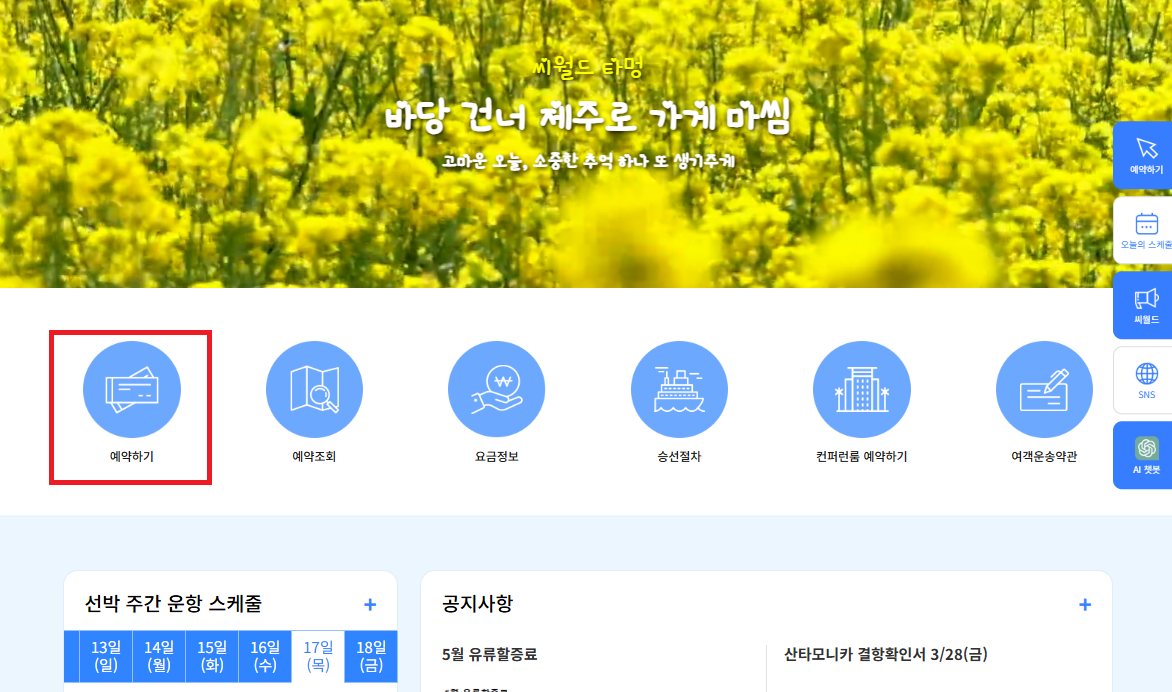 - 홈페이지 접속 → ‘승선권 예매’ 클릭
