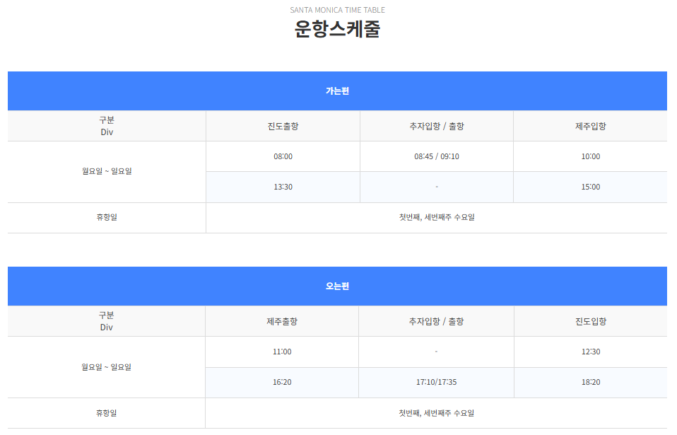 | 제주항 | 진도항 | 오후 13:30 | 오후 15:00 | 약 1시간 30분 |